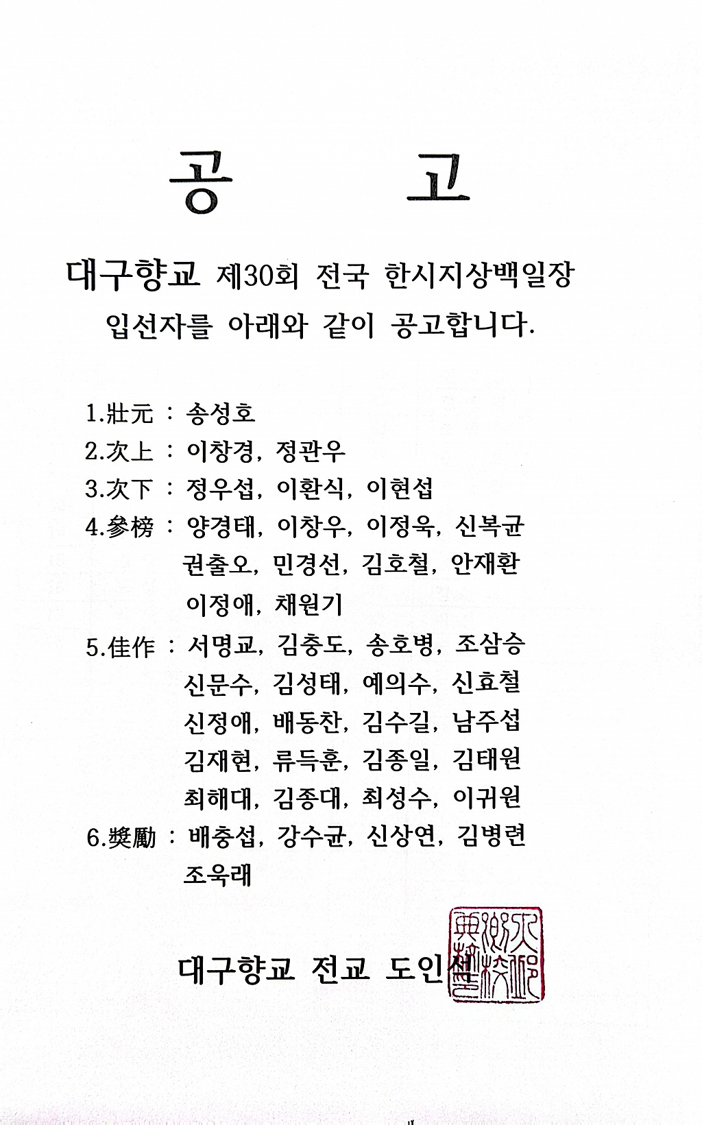 제30회 한시백일장 입상자 발표
