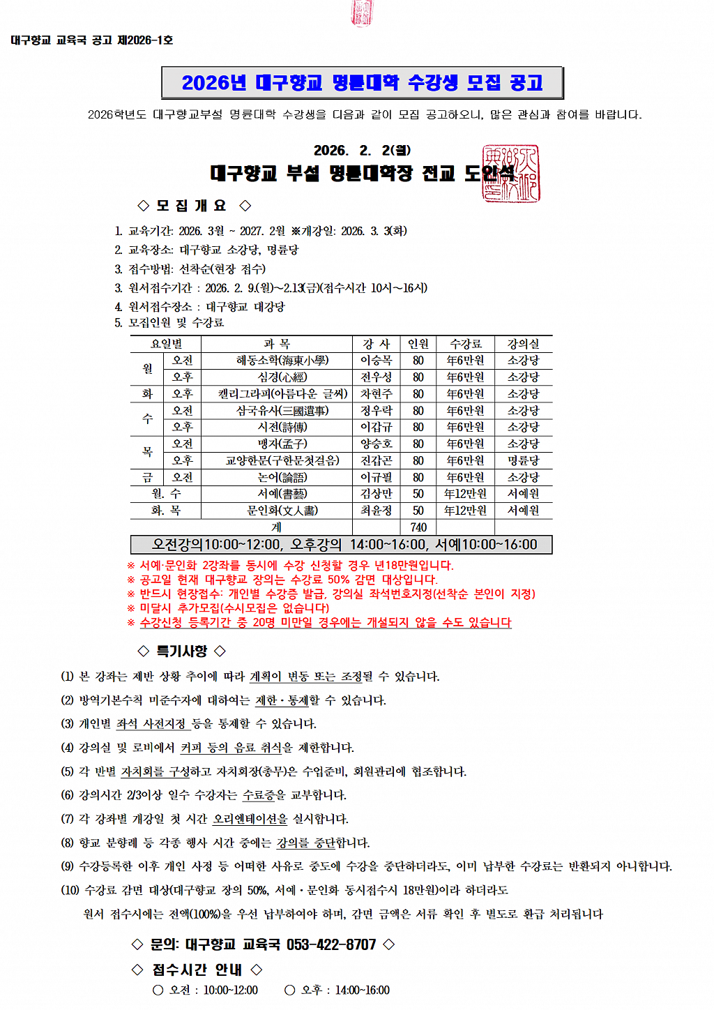 2026년 대구향교부설명륜대학 수강생 모집공고